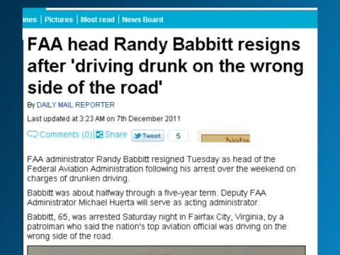 【新唐人2011年12月8日訊】美國民航界“掌門人”、聯邦航空管理局(FAA)局長巴比特接到了人生中最慘痛的一張罰單,他因為酒醉駕駛而丟掉了烏紗帽。