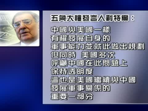 【新唐人2011年12月8日訊】中美兩國在太平洋地區展開角逐之際,美國國防部發言人最近表示,中國有權發展自己的軍事力量,但需要保持完全的透明度。