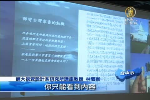 【新唐人亞太台2011年12月8日訊】接到家書時的感動,是否還讓您記憶猶新?享有「台灣設計界導師」之稱的林磐聳教授,從2007年起,在全球各地旅程中,將明信片寄給台灣,寄給自己,用郵戳上的「時間」與「地點」繪寫想念台灣的家書。東海大學藝術中心正展出他歷年知名的平面設計海報和380餘封「台灣家書」,希望讓大家看見台灣、用生命書寫台灣。