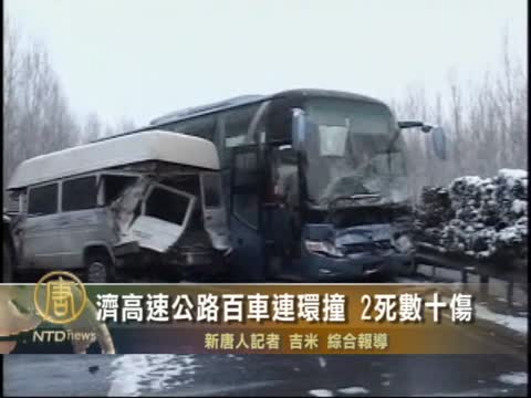 【新唐人2011年12月9日訊】星期四(十二月八日)上午,山東省濟青高速公路生一起連環相撞大車禍,大約有一百輛車輛撞在一起,已經有2人確定當場死亡、3人重傷,數十人輕傷。