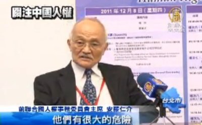 【新唐人2011年12月10日訊】世界人權日前夕,多位國際人權事務權威,今天在台發聲,譴責中共迫害法輪功,他們包括前聯合國酷刑特專范波文、前聯合國人權事務委員會主席安藤仁介、前韓國人權委員會主席安京煥等人,他們要求中共停止迫害,恢復中國百姓的信仰自由。