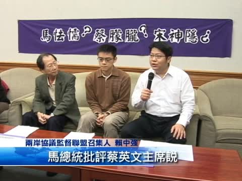 兩岸協議監督聯盟召集人賴中強:「馬總統批評蔡英文主席說,她講的台灣共識,聽來聽去好像只有一個民主程序,那不能夠只是一個民主程序,我想這點我們認同,但是我們也要告訴馬總統,沒有錯不能只有民主程序,但是做一個總統,你要推動兩岸關係,可不能連民主程序都沒有。」