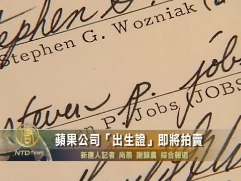 【新唐人2011年12月13日訊】最近最受矚目的拍賣品,可能數得上蘇富比(Sotheby"s)即將在12月13號拍賣的蘋果創始合同原件。這份由「蘋果教父」喬布斯和另外兩位合夥人在1976年簽署的蘋果公司「出生證書」預計拍價在10萬美元到15萬美元之間。