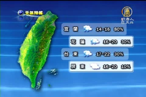 【新唐人亞太台2011年12月15日訊】來關心天氣,大陸冷氣團發威,氣溫一路下降,越入夜越濕冷,北部和東北部明後天的低溫還會下探11度,提醒民眾要注意保暖。而原本在關島附近的熱低壓,已在下午2點升級為輕颱瓦西,目前不會直接影響台灣。以下帶您關心12月16號星期五的天氣預報。