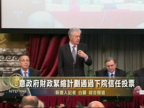 【新唐人2011年12月17日訊】意大利總理馬里奧•蒙蒂(Mario Monti)總額330億歐元的財政緊縮計劃星期五在國會下院信任投票中獲得通過,從而加快了國會審批該計劃的步伐,這項計劃的目的是恢復市場對意大利經濟的信心,促使緩慢增長中的經濟恢復動力。