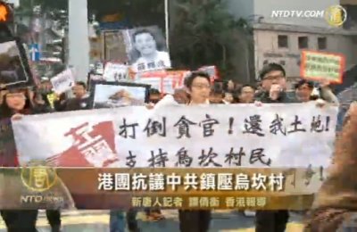 【新唐人2011年12月18日訊】廣東陸豐烏坎村逾萬村民維權遭中共當局鎮壓事件,持續引起全球關注。香港有團體星期六到中共政府駐港辦事處聲援村民,示威者帶同紅色封條,高呼封鎖中聯辦,要求立即解除對烏坎村的包圍。