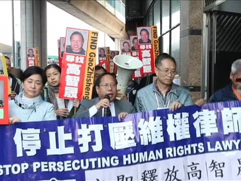 中國維權律師關注組和支聯會20多名成員,由西區警署遊行到中聯辦,強烈抗議中共當局濫用司法程序踐踏人權,要求立即釋放高智晟。關注組主席何俊仁指出,高智晟律師因協助法輪功而遭中共迫害,5年來經受24小時監控,被強迫失蹤。中共突然以「多次嚴重違反緩刑條件」將高智晟收監,是慾加之罪。