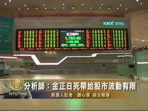 【新唐人2011年12月19日訊】朝鮮領導人金正日死訊傳出後,因擔憂朝鮮半島局勢不穩,星期一(12月19日)亞太各主要股市紛紛下跌,其中以韓國股市跌幅最大。有分析師認為,這種波動只是短暫現象。