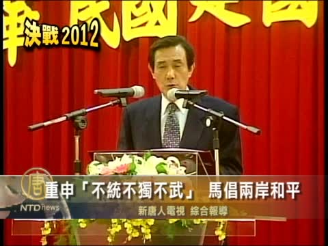 【新唐人2011年12月24日訊】二零一二台灣大選首場公辦政見會,在週五結束。國民黨候選人馬英九和民進黨候選人蔡英文,會後再度針對九二共識隔空交火,星期六(12月24日)中午,馬英九在參加退役將領聯誼會時,就強調,如果要選中華民國總統,就必須承認九二共識,不能有任何折扣。