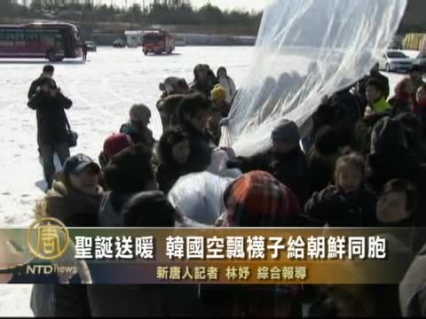【新唐人2011年12月24日訊】在韓國,民眾向來會空飄傳單到朝鮮,告訴那裏的人一些被封鎖的消息。在下雪的聖誕節前夕,韓國民間團體又準備了空飄大氣球,這次他們要送的是襪子,希望在鐵絲網另一邊的朝鮮同胞,也能感到溫暖。