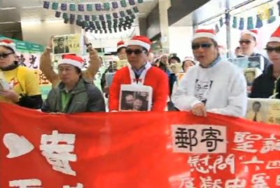 星期五,一批支聯會成員戴著墨鏡到中環郵政總局,將過去一個多月收集市民簽名的近4千張的聖誕卡和明信片,寄給大陸獄中的維權異見人士,以及中共迫害遇難者的家屬。今年特別寄給失明維權人士陳光誠和剛被收監服刑3年的維權律師高智晟,以及烏坎村村民代表薛錦波的家人。