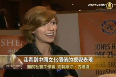 維吉尼亞·古德溫:「出門之前我還跟克莉絲汀說,這是我們聖誕節的一個重要禮物,絕對值得。我們非常喜歡,很好看。這個下雨天也變得明亮了。我們好喜歡這個演出。裡面有好多不同的內容。我喜歡那些練武的場景,年輕人訓練的,非常好看。美麗的色彩,我奇怪他們怎麼換裝那麼快,需要很好的協調才行。」