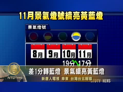 【新唐人2011年12月27日訊】由於歐債危機干擾全球市場信心,景氣持續走弱,來看到,行政院經濟建設委員會今天公布上月景氣對策信號,燈號續亮黃藍燈,只差1分就轉為藍燈,顯示目前國內景氣走緩的趨勢,相當明顯。
