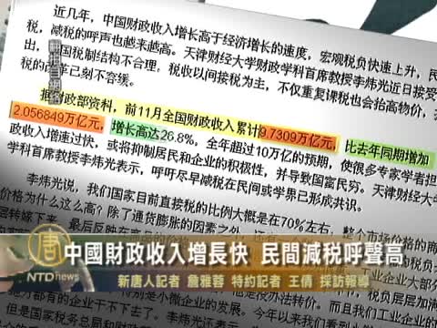 【新唐人2011年12月28日訊】近幾年,中國財政收入增長高於經濟增長的速度,宏觀稅負快速上升,民間減稅的呼聲也越來越高。大陸學者指出,中國稅制結構不合理,稅收以間接稅為主,不僅重復課稅也會抬高物價,因此稅改應該加快步伐。