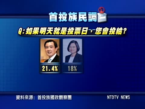 來自各大專院校學生組成的「首投族國政觀察團」公布民調。如果明天就是投票日,[圖卡1]有21.4%的首投族會投給馬英九、18%投給蔡英文,[9.1%投宋楚瑜],但是有34.5%的首投族還沒決定要投誰,而且有17%的人已經決定不去投票。