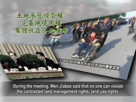 廣東烏坎村爆發村官賣地的違法事件後,27號在北京舉行的大陸中央農村工作會議,特別引人關注。 溫家寶說,土地承包經營權、宅基地使用權、集體收益分配權等,是法律賦予農民的合法財產權利,任何人都無權剝奪。然而,徵收土地、強拆在大陸各地一直在上演著,法律也保護不了人民的權益。
