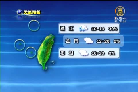 【新唐人亞太台2011年12月29日訊】來關心天氣,明天受東北季風影響,北部、東部地區有短暫雨,今天入夜後,北部氣溫將會降到14度,中南部也要注意溫差變大,隨時添加保暖衣物。以下帶您關心12月30號星期五,全台各地以及世界各主要城市的天氣預報。