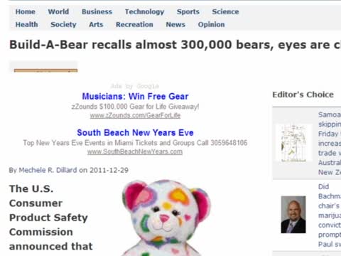 【新唐人2011年12月30日訊】美國消費品安全委員會(U.S. Consumer Product SafetyCommission)近日宣佈,「熊熊工作室」正在美國和加拿大回收近30萬隻中國大陸製造的七彩愛心熊,因為這些玩具可能會造成兒童窒息。
