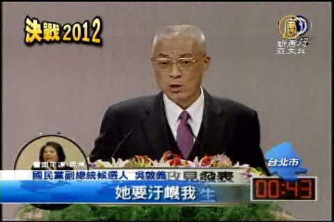 【新唐人亞太台2012年1月2日訊】副總統候選人政見發表會在今天(2日)晚間八點登場,其中吳敦義與蘇嘉全的攻防戰火,圍繞在情蒐與清廉議題,馬上帶您看他們的發言。