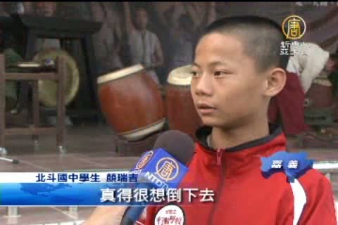 【新唐人亞太台2012年1月6日訊】一群來自弱勢家庭、年僅14到16歲的青少年,在優人神鼓藝術團和學校老師的指導下,以「雲腳」走一天路、打一場鼓的方式,預計走完西台灣13個鄉鎮,雖然學習打鼓只有短短半年時間,但這群青少年卻以精湛的擊鼓技巧,博得熱烈的掌聲。透過鏡頭帶您一起去看看。
