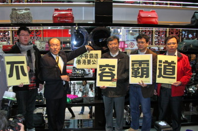 香港立法會議員馮檢基:“我們今天的行動也告訴香港商人聽,甚至告訴國際人士聽,香港是不容許有霸道的商人。”