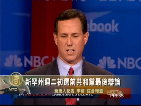 【新唐人2012年1月9日訊】美國共和黨總統候選人提名戰週二將在新罕布希威爾州展開。在星期天舉行的最後一場電視辯論會上,目前6位候選人中的領跑者羅姆尼成為了其他對手的眾矢之的。