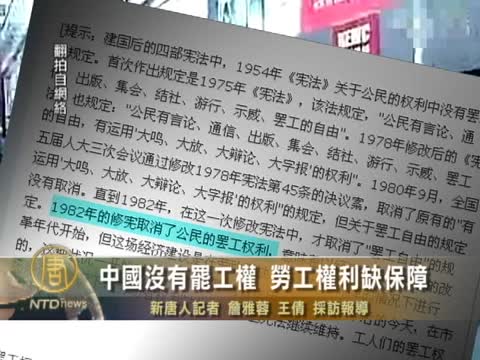 【新唐人2012年1月10日訊】近來,中國罷工事件不斷,工人們集體遊行集會維權,常遭到當局出動大批警察鎮壓抓捕或驅趕,常州大學法學副教授劉運亞表示,罷工權作爲一項憲法基本權利早已成爲國際立法慣例,但是中國的勞工沒有罷工權,因此勞動者缺乏基本權利保障。