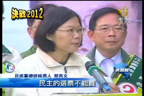 【新唐人亞太台2012年1月12日訊】選戰倒數兩天,民進黨總統候選人蔡英文今天(12日)到桃園掃街,喊出催票令,要選民一定要返鄉投票,對於各地賄選傳聞不斷,把總統和立委票綁在一起買,蔡英文呼籲選民,人情要顧,台灣未來更要顧,對於自己的選情,她很有信心。