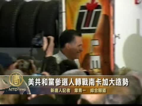 【新唐人2012年1月13日訊】美國共和黨總統參選人週四在南卡羅來納州加大了競選造勢力度。繼愛荷華和新罕勝出之後,羅姆尼(Mitt Romney)正力爭贏得三連勝。如果他能“三連冠”, 就有極大可能成為共和黨內跟奧巴馬較量的人。 而他的對手們也不甘示弱,努力阻止他再奪去頭把交椅。
