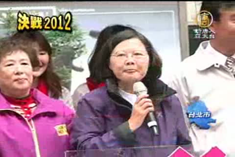 【新唐人亞太台2012年1月13日訊】選前一天,民進黨總統候選人蔡英文,將大部分的掃街行程,安排在台北地區,蔡英文一早先從基隆出發,之後前往台北市信義商圈,與副總統候選人蘇嘉全大會師。而晚間先在桃園出席造勢晚會,隨後蔡英文就會趕往板橋的選前之夜晚會,做最後的衝刺。