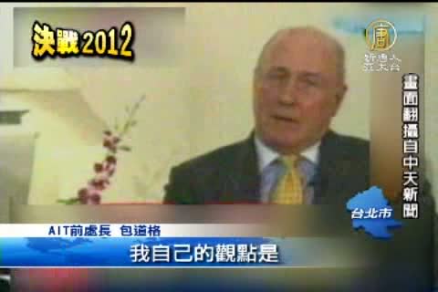 【新唐人亞太台2012年1月13日訊】美國在台協會(AIT)前台北辦事處處長包道格,接受媒體專訪,表態挺馬,說如果馬英九連任,會讓北京和華府大大鬆一口氣,因為這代表繁榮有建設性的狀態可以維持,這番談話,AIT今天(13日)立刻回應,這只是包道格個人看法,不代表美方態度。