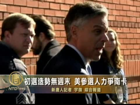 【新唐人2012年1月15日訊】星期六(1月14號),美國共和黨總統參選人沒有停下為大選造勢的腳步,全部聚集在南卡羅來納州,為21號的南卡初選爭取選票。