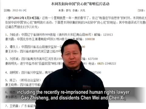 【新唐人2012年1月16日訊】俗話說「每逢佳節倍思親」,再過一個星期,中國新年就到了。維權網站《參與網》最近發起活動,呼籲各界人士向身陷牢獄的中國「良心犯」郵寄明信片。也有海外人士向被中共非法關押的大陸法輪功學員發信,表達新年的問候和支持。下面請看本臺記者的報導。
