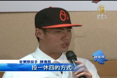 【新唐人亞太台2012年1月16日訊】職棒左投陳偉殷今天(16日)正式加盟美國職棒大聯盟巴爾的摩金鶯隊,球團和經紀公司舉行隆重的記者會。陳偉殷不但是金鶯隊有史以來第一位簽約的台灣選手,也是第一位先在日本職棒發展,再轉戰美國大聯盟的球員,陳偉殷說,接下來他首先要克服的是,投一休四的比賽方式,他也相信自己可以勝任成功。
