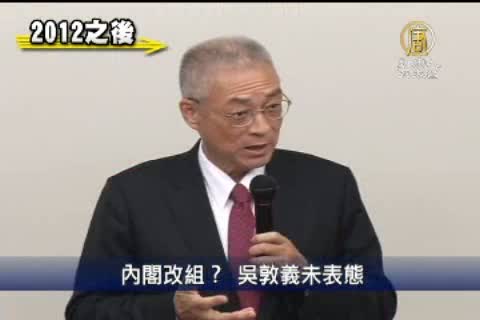 【新唐人亞太台2012年1月17日訊】總統大選勝選後,行政院長吳敦義,今天首度對媒體發表談話,對於內閣改組,吳敦義並沒有表明2月1日是否總辭,只有說:「未來中間可能會有一段比較輕鬆」。吳敦義即將接任副總統,引發外界關注內閣改組是否提前啟動。今天(17日)中午與媒體餐敘時,吳敦義並沒有正面答覆,記者追問是實質改組,還是形式總辭,吳敦義表示,沒有總辭不總辭問題,一切都會合乎憲法規定。另外,馬總統將從明天展開謝票之旅,吳敦義表示,若在行程上能夠配合,會盡量與馬總統一同謝票,向民眾表示感謝。