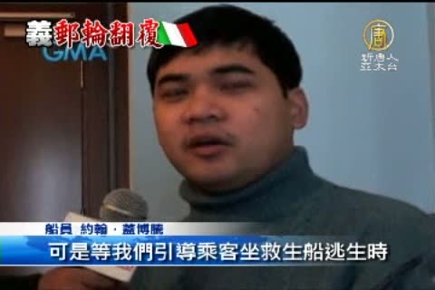 【新唐人亞太台2012年1月17日訊】來關心國際重要訊息。星期一(16號)晚上,救援人員在義大利擱淺半沉沒的郵輪「協和號」附近救援,包括船東和船員都指出:船長在這次事故中,有重大的責任。義大利海岸警衛隊還宣佈,除了已經發現的6具屍體,失蹤人數從稍早的16人,已經上升到29人。