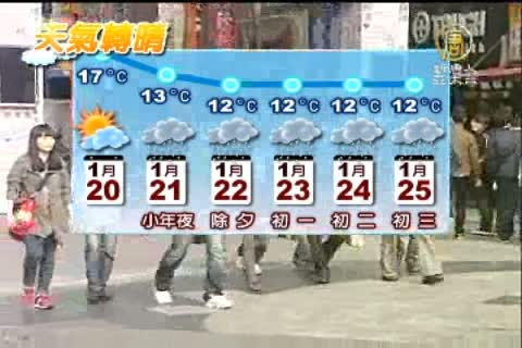 【新唐人亞太台2012年1月17日訊】由於東北季風減弱,鋒面遠離,今天全台各地都出現好久不見的溫暖陽光,不過要提醒您,從小年夜開始,另一波冷氣團又要來報到,除夕最冷,低溫將會下探12度。