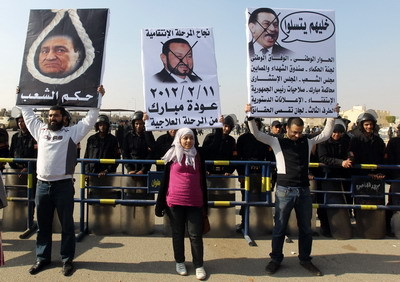 法庭外,一些憤怒的人群高喊口號手舉標語、圖片,譴責穆巴拉克在去年年初的反政府抗議中屠殺抗議民眾。