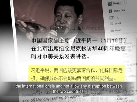 【新唐人2012年1月18日訊】16號,北京舉行紀念尼克松訪華40週年晚宴。中共國家副主席習近平在致辭時表示,中美兩國應該「密切合作」。在中美關係備受人民幣匯率、南海等問題困擾的時刻,習近平的這番講話,被外界認為是在向美國示好。下面請看本臺記者的報導。