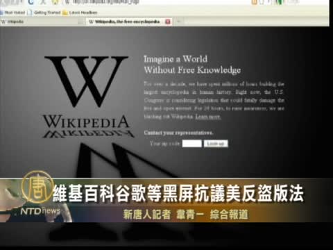 【新唐人2012年1月19日訊】維基百科網站星期三(1月18日)將其英文版關閉24小時,黑屏抗議美國國會正在討論的反盜版法。谷歌等數千家網站也用黑屏加入了抗議。抗議的互聯網巨頭們認為,法案將侵犯言論自由,並迫使一些網站關閉,危害科技行業。有分析說,這是年輕而缺乏組織的互聯網業對抗老牌媒體巨頭的一場大戰。在這場大戰展開之際,法案的三位提案人也公開放棄了對法案的支持。