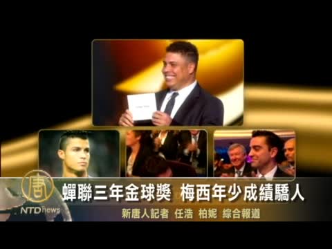 【新唐人2012年1月19日訊】西班牙巴塞羅那俱樂部的阿根廷球星梅西(Lionel Messi)1月9號,奪得國際足聯(FIFA)的2012年度金球獎,讓世人刮目。這已經是現年24歲的梅西連續第三年獲得金球獎,同時他還是2009年度的世界足球先生,2010年度歐洲金靴獎得主和2011年的歐洲足球先生等衆多獎項的獲得者。一起看看他這次得獎的成績。