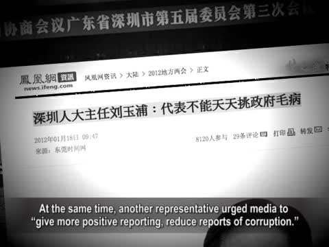 【新唐人2012年1月20日訊】大陸各地兩會相繼召開,隨著兩會的召開,深圳兩會常委會主任以及其他代表提出,反對人大代表天天挑黨政官員的毛病,媒體應多作正面宣傳,少報導腐敗案,兩會官員的言論成為民眾的笑柄。學者表示,中共媒體本來就是黨的喉舌,不代表人民的心聲。