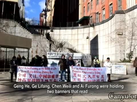 1月18號,在美國紐約曼哈頓聯合國廣場,流亡美國的中國訪民葛麗芳、艾福榮、陳偉麗等人頂著8-9級的強風,拉出為高智晟的妻子耿和製作的醒目條幅,上面用中英文雙語書寫著:「還我丈夫高智晟,生死不知沙雅城」和「全球關注中國維權律師高智晟的生死安危」。