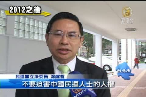民進黨立法委員 涂醒哲:「(跟中共說)不要迫害人權,不要迫害法輪功的人權,不要迫害台灣的人權,不要迫害中國民運人士的人權」「如果馬英九做得到的話,我也樂觀他得到諾貝爾和平獎」