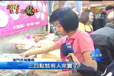 【新唐人亞太台2012年1月21日訊】今天是過年假期的第一天,新聞一開始,先帶您看到,台北市南門市場,今天一早就擠滿了採買年貨的民眾,尤其是熟食區,人更是多到寸步難行,業者說,昨天忙到凌晨一兩點,但是今天清晨四五點就有客人上門,買熟食的民眾覺得價格似乎有貴個一兩成,因為一千元買沒兩樣東西,就花光光。
