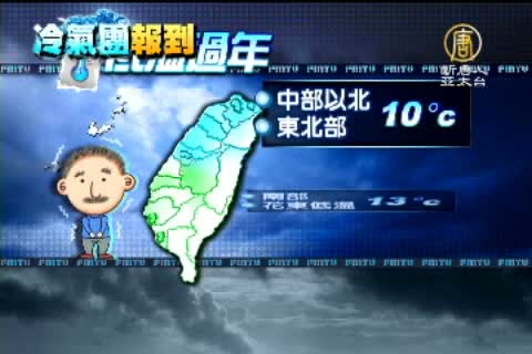 【新唐人亞太台2012年1月21日訊】明天除夕夜,全台都是冷颼颼!中央氣象局發布低溫特報,提醒從除夕開始到初四,北部沿海地區可能出現10度低溫,中北部地區在初三之前,也有明顯雨勢,而南部地區儘管雨量較少,但低溫也有13度,氣象局建議民眾,出遊選在初三之後比較適合。