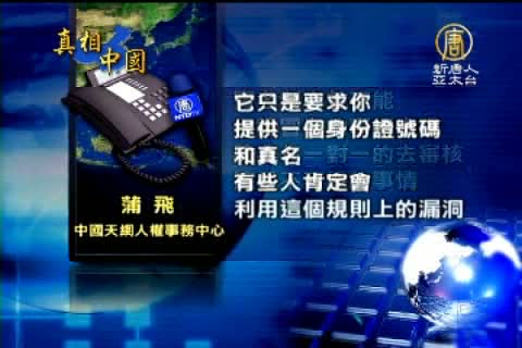 「中國天網人權事務中心」發言人蒲 飛:「實名制它並不能保證冒名的事情出現,除非你一對一的去審核,這是不可能的事情,它只是要求你提供一個身份證號碼和真名,有些人肯定會利用這個規則上的漏洞,甚至一些專門機關也會將一些異議人士的真實身份和姓名拿去註冊,最後達到一個構陷的目地。」