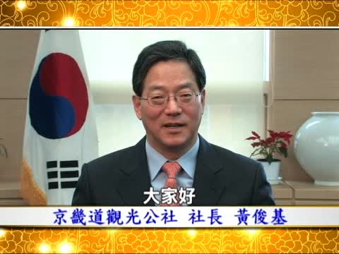 全世界新唐人電視臺的觀眾朋友們,大家好。我是韓國京畿道觀光公社的社長黃俊基。京畿道就像韓流一樣,匯聚了韓國所有富有魅力的要素。如果您來京畿道遊玩兒,就能享受到韓流別具特色的樂趣。在新的一年裏,祝大家家庭美滿,闔家康健。新年快樂。
