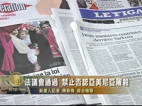 【新唐人2012年1月24日訊】法國參議院星期一(1月23日)晚間在經過7個小時的辯論之後,通過法案,禁止任何人在法國否認亞美尼亞大屠殺事件的存在。這項普遍受到法國民眾支持的法案,正危及土耳其與法國關係,請看下面報導。