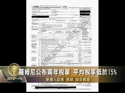 【新唐人2012年1月25日訊】面對日益增加的政治壓力,美國共和黨總統參選人羅姆尼24日公布了他2010年和2011年的稅務資料,顯示他兩年收入約4520萬美元,幾乎全部來自投資收益,平均繳納的稅率低於15%。